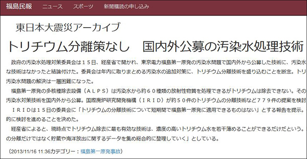 日本《福島民報》早在2013年11月時就報道稱,日本政府“污染水處理對策委員會”當初在處理核廢水時,就曾探討如何過濾氚,並且在當年10月面向全球徵集包括“氚分離”技術在內的“核廢水處理方案”。