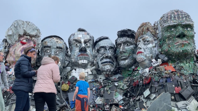 用廢棄電子產品製作的“總統山”矗立在七國集團峯會舉辦地附近。視頻截圖