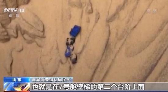 **青島海關緝私局民警:**也就是在7號艙壁梯的第二個台階上,發現了兩個旅行包,是可疑物品。在壁梯旁邊大豆堆裏面還有五包,懷疑這五包是從壁梯第二個台階滑落下來的。