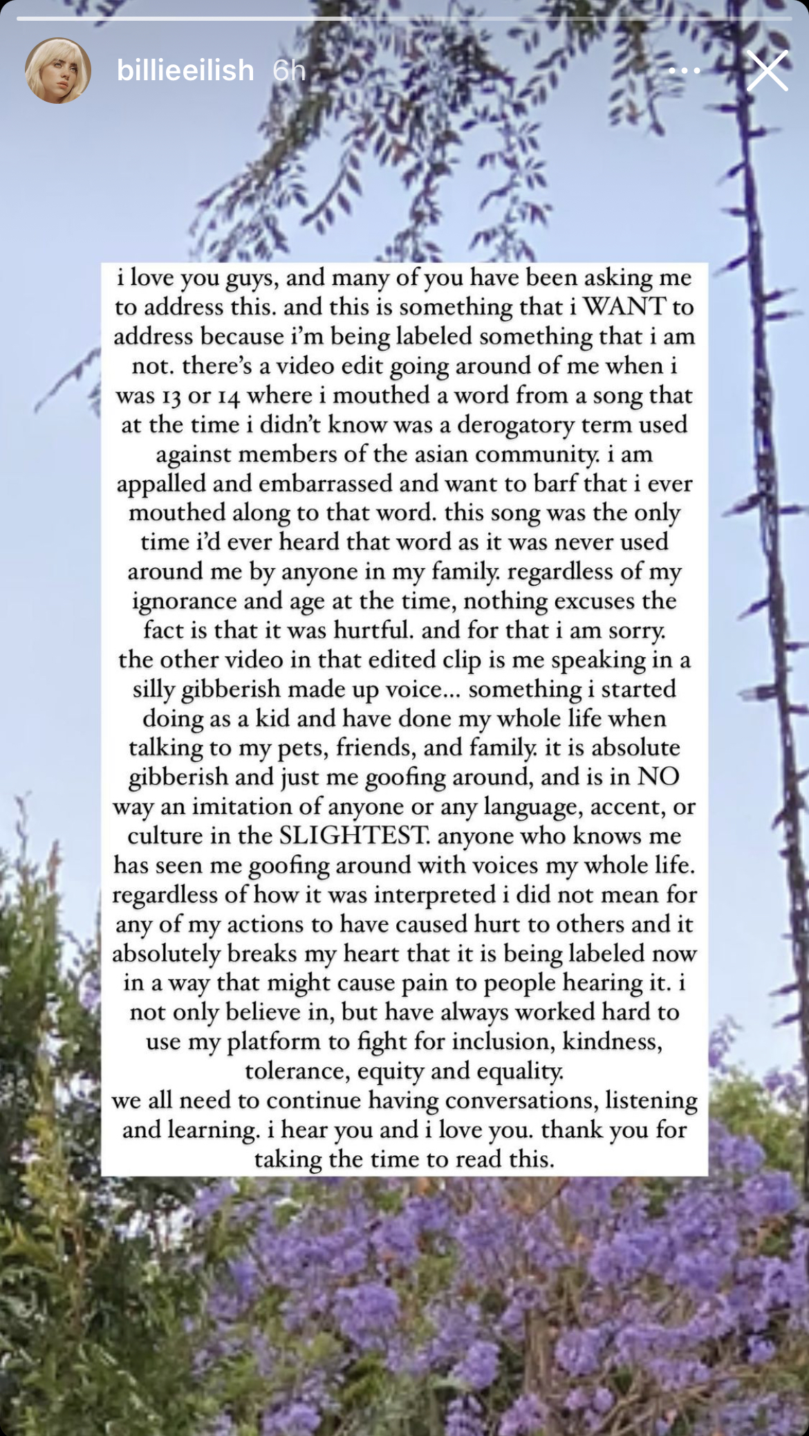 【文/觀察者網 嚴珊珊】當地時間6月21日,針對歧視亞裔和辱華的質疑,美國歌手比莉·艾利什(Billie Eilish,中國網友習慣稱其為“碧梨”)在Instagram Story裏髮長文道歉稱,她13、14歲時在一首歌裏隨意對嘴“chink”,並不知道這是一個貶低亞裔的詞,再次看到她感到“震驚和尷尬”,年幼無知不是藉口,她對此感到抱歉。