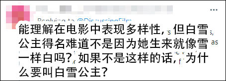 然而,這一説法美國網友並不買賬,原因是其膚色不夠“白”,有網友表示,“能理解電影中想表現多樣性,但白雪公主名字的來源難道不是因為公主的皮膚像雪一樣白嗎?”