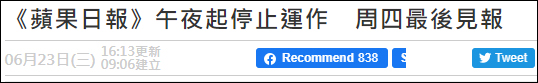 不過,“東網”等港媒稍後更新稱,壹傳媒董事會23日召開緊急會議,商議後決定《蘋果日報》午夜起實時停止運作,明日(24日)出版最後一期報紙,電子版於同日凌晨起暫停更新。