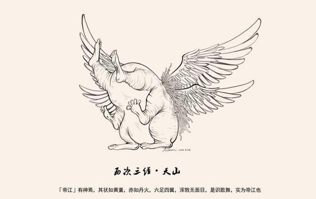 在《山海經》中,帝江被描述成,“有一個神(神鳥),形狀像個黃布口袋,紅得像一團紅火,六隻腳四隻翅膀,耳目口鼻都沒有,但卻懂得歌舞。”