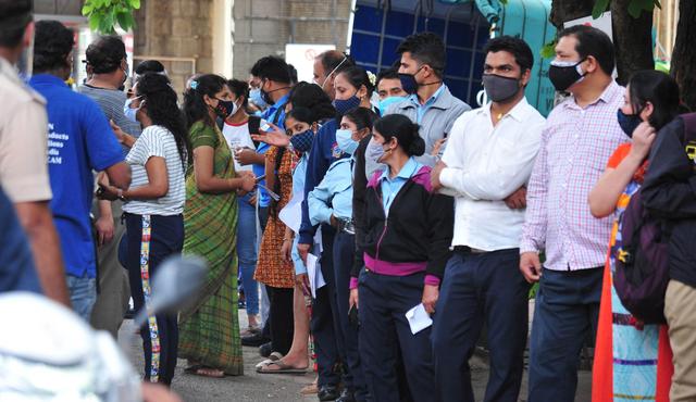 5月10日,人們在印度班加羅爾排隊等待接種新冠疫苗。圖自新華社