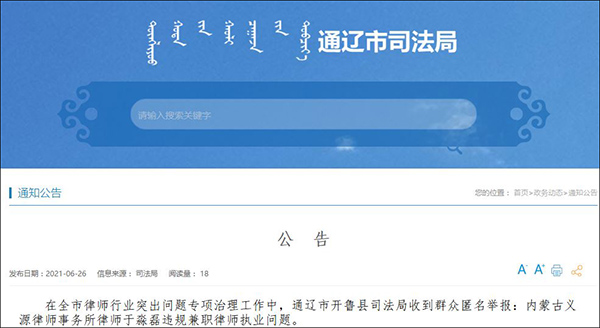在全市律師行業突出問題專項治理工作中,通遼市開魯縣司法局收到羣眾匿名舉報:內蒙古義源律師事務所律師於淼磊違規兼職律師執業問題。