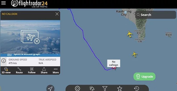 據悉,有專門記錄軍事飛行器動態的軍迷指出,26日上午11點多,他通過全球航班信息追蹤軟件Flightradar24和Plane Finder發現,一架沒有呼號(No callsign)的飛機在台灣島西南空域飛行,一路飛往巴士海海峽,隨後轉向東南空域飛去,非常靠近蘭嶼外海後,飛機識別信號隨即消失。