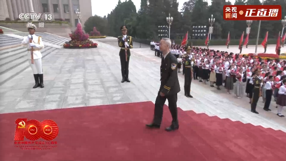 “七一勳章”獲得者抵達人民大會堂。人民大會堂東門外,高擎紅旗的禮兵分列道路兩側,18名禮兵在台階上持槍佇立,青少年熱情歡呼致意。
