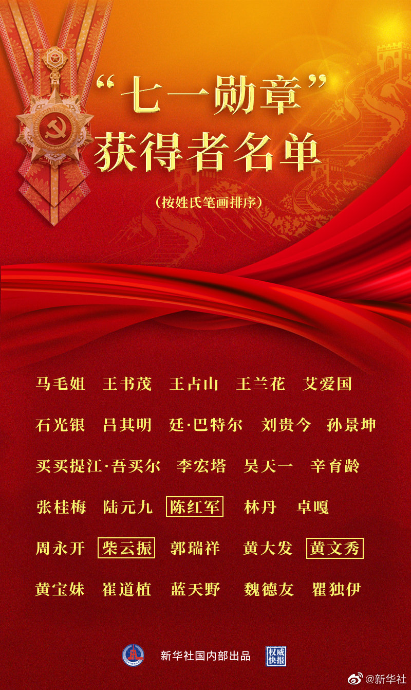 根據《中共中央關於授予“七一勳章”的決定》,授予29名同志“七一勳章”。