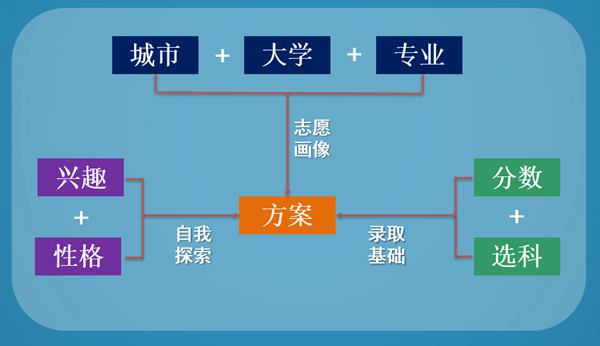 從整體上來説,筆者將整個志願填報這道考題分為了三個部分:錄取基礎、自我探索、志願畫像,這三個部分的交集,才是可以作為方案的志願選項。其後志願的順序就是按照錄取可能性的高低排列,衝一衝保一保了。
