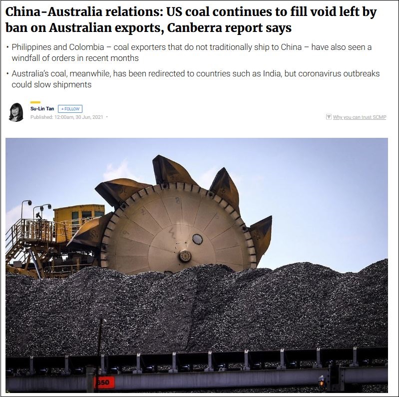 《南華早報》援引澳大利亞工業部報告稱:美國煤炭正持續填補澳大利亞留下的空缺