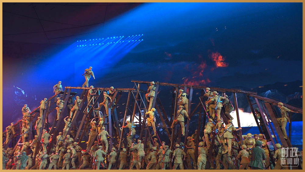 這場演出以大型情景史詩形式呈現,共分為“浴火前行”“風雨無阻”“激流勇進”“錦繡前程”四個篇章。中央舞台的巨型屏幕,呈現流淌的史詩畫卷。情景合唱與舞蹈《戰旗美如畫》,還原抗美援朝的烽火歲月。合唱與舞蹈《行進的火炬》,重温北京奧運會經典場景。