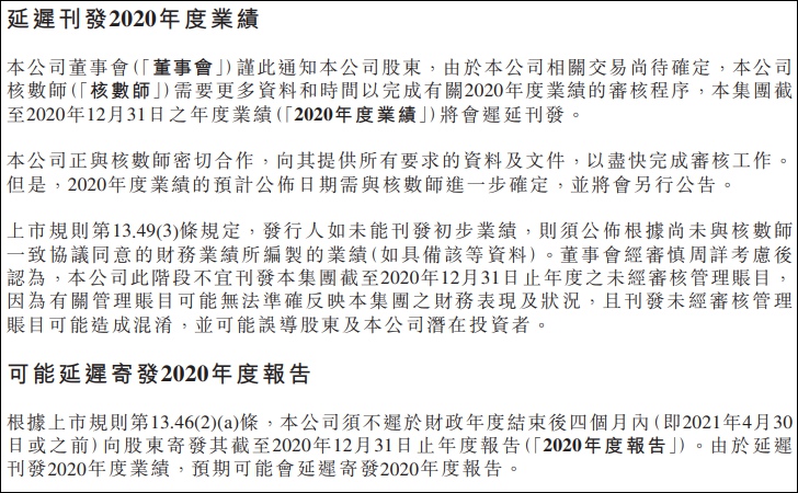今年3月31日,華融已發佈過一份“可能延遲寄發2020年度報告”的公告,稱“由於本公司相關交易尚待確定,公司核數師需要更多資料和時間以完成有關2020年度業績的審核程序,本集團截至2020年12月31日之年度業績(“2020年度業績”)將會遲延刊發。”
