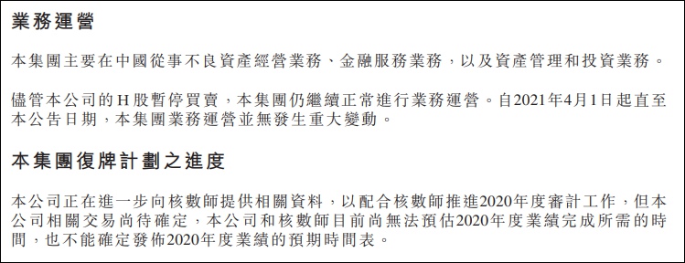 由於2020年報持續難產,華融的股票會繼續暫停買賣,股東大會也將延遲召開,不過華融方面還表示,自2021年4月1日起直至6月29日,本集團業務運營並無發生重大變動。