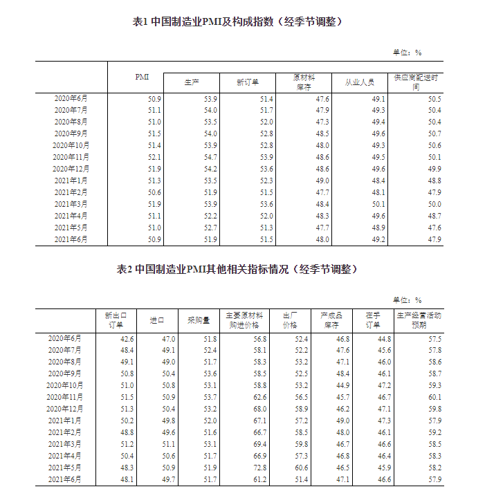 國家統計局網站6月20日消息,國家統計局公佈2021年6月中國採購經理指數運行情況: