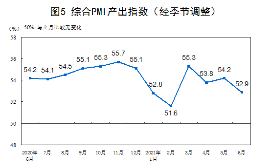 6月份,綜合PMI產出指數為52.9%,比上月回落1.3個百分點,表明我國企業生產經營活動總體擴張步伐有所放緩。