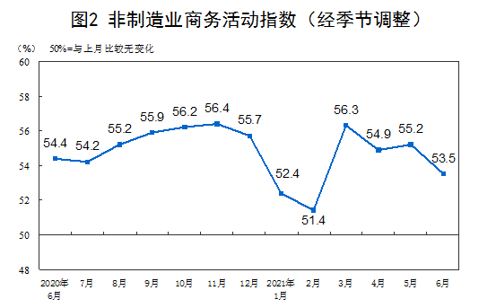 6月份,非製造業商務活動指數為53.5%,較上月回落1.7個百分點,非製造業擴張力度有所減弱。