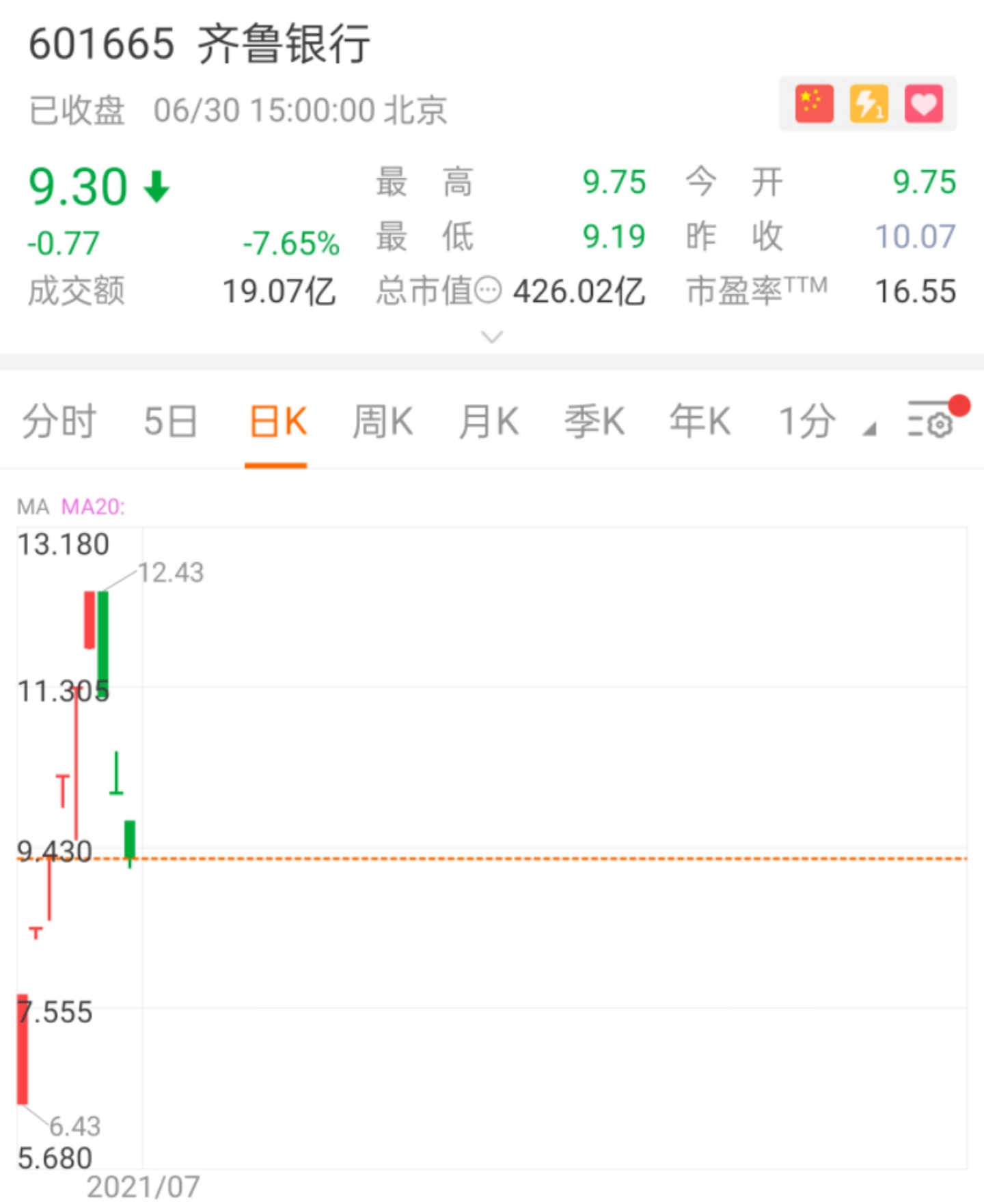 6月28日,齊魯銀行開盤直奔跌停,終結了上市以來的連續6個漲停板。截至今天收盤,齊魯銀行收跌7.65%,股價已較上市以來的最高價格跌去25%。