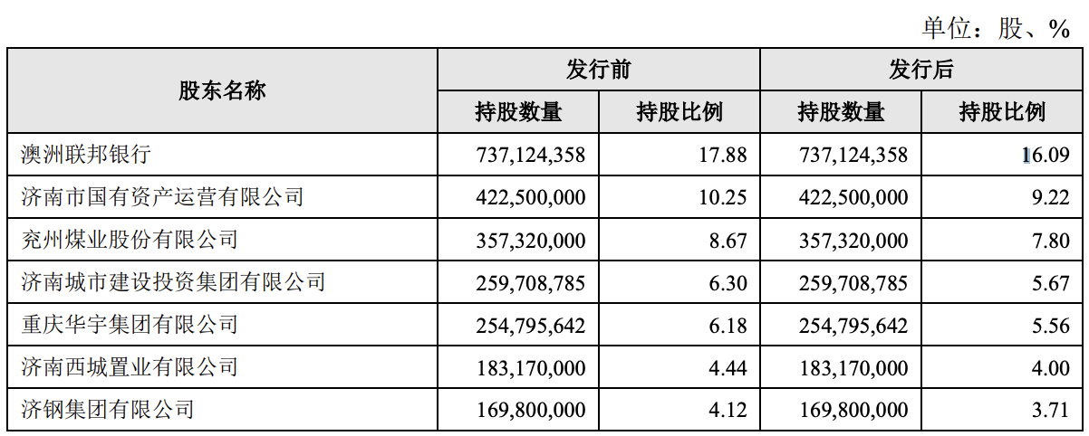 本次發行後,澳洲聯邦銀行持股比重將降為16.09%,仍位居齊魯銀行第一大股東。
