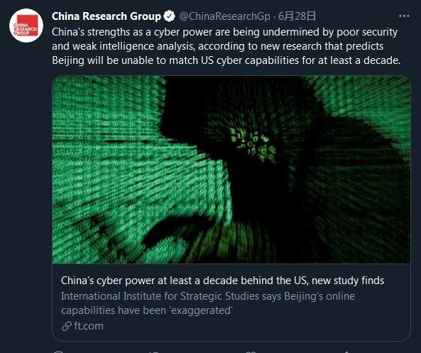 “中國研究集團”28日在推特上渲染中國“網絡威脅”