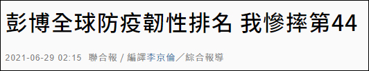 自去年11月起,彭博社每月都會推出一版“全球抗擊新冠能力排名”。6月28日的最新榜單顯示,美國升至第一,中國大陸排名第八,台灣地區跌至第44位,被台媒形容為“慘摔”。