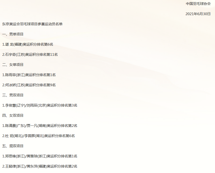 5月底,世界羽聯確認,關乎東京奧運會羽毛球項目參賽資格的奧運積分賽已全部結束。根據規則,如果一個協會有兩名選手排名奧運積分榜單打項目前16名或兩對選手排名雙打項目前8名,則該協會最多可以派出在此範圍內的兩名或兩對選手參賽。中國隊在男單、女單、女雙和混雙4個項目上都拿到了滿額參賽資格。