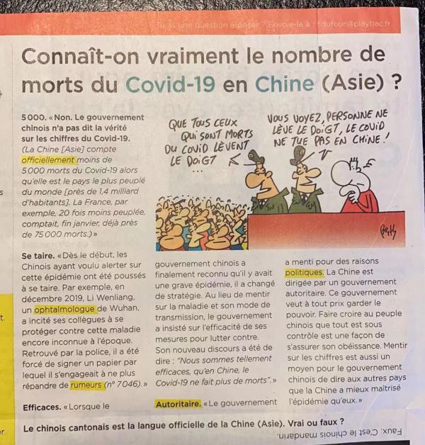 這位網友説,看報的小朋友還有他們的法國朋友一傳十,十傳百,就只會覺得中國人不好。文章裏沒有領着孩子去思辨,學會從多角度看問題,而是簡單地概括總結,進而甚至引發普遍性的對“中國人”的仇視。這是對全球華人的污衊、侮辱,對於勤勤懇懇學習工作,努力融入法國社會的在法華人、華二代,更可能帶來現實的傷害。