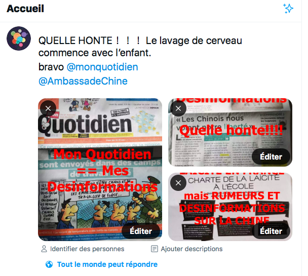 在社交平台上,華人斥責該報提供“假信息”,“可恥”,並@了駐法大使