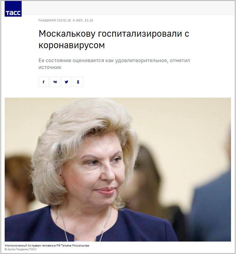 據塔斯社7月5日消息,俄羅斯聯邦總統人權事務全權代表辦公室的代表透露,俄總統人權事務全權代表塔季揚娜·莫斯卡利科娃(Татьяна Москалькова)日前因感染新冠病毒已住院接受治療。