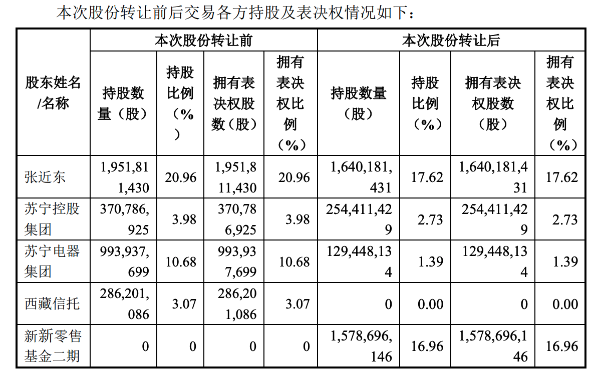 張近東、蘇寧控股集團、蘇寧電器集團、西藏信託擬將所持公司合計數量占上市公司總股本16.96%的股份轉讓給新新零售基金二期。其中,張近東將其所持公司2663萬股、蘇寧電器集團將其所持公司7900 萬股通過大宗交易轉讓給新新零售基金二期;其餘交易均系通過協議轉讓方式完成。