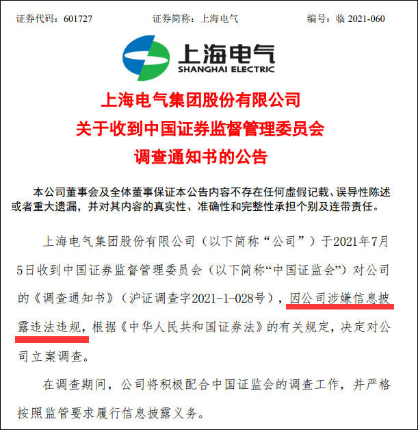 7月5日,上海電氣(601727.SH)公告披露,該公司當天收到中國證監會的《調查通知書》:因該公司涉嫌信息披露違法違規,根據《中華人民共和國證券法》的有關規定,決定對該公司立案調查。