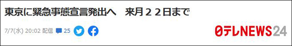 報道援引日本政府幹部的話稱,鑑於東京近期疫情形勢再次“反彈”,日本政府基本決定向東京都發布緊急事態宣言。據悉,本次緊急事態宣言時間將到8月22日為止。