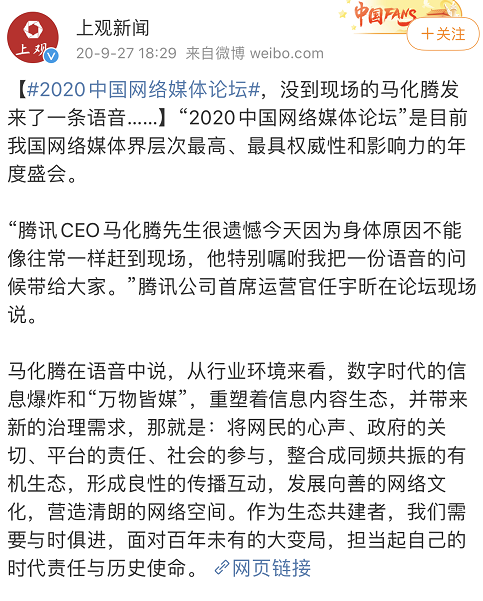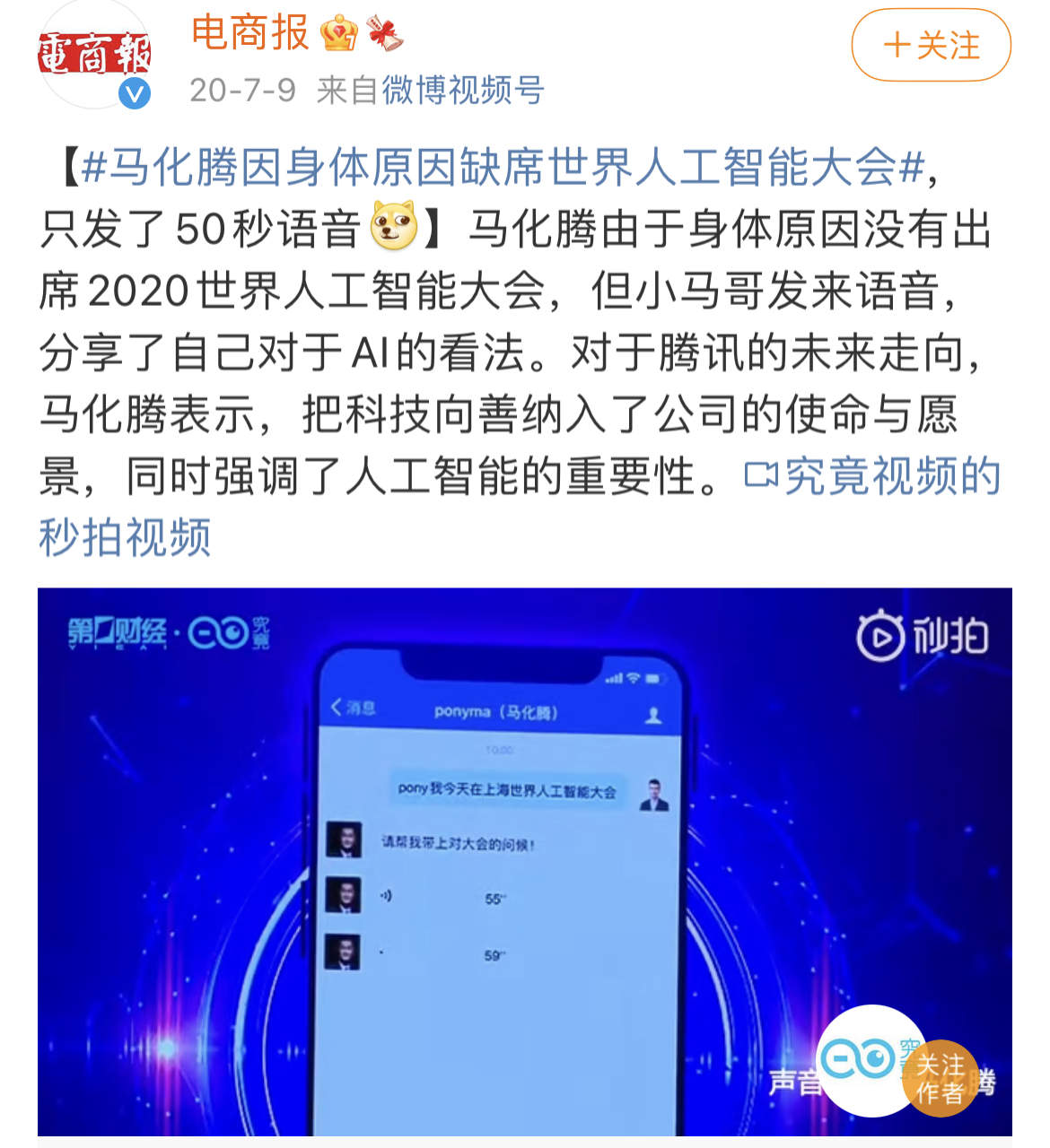 這不是馬化騰第一次用語音參會,去年的世界人工智能大會上,馬化騰因身體原因就未到現場,也只發了兩條50多秒的語音信息。
