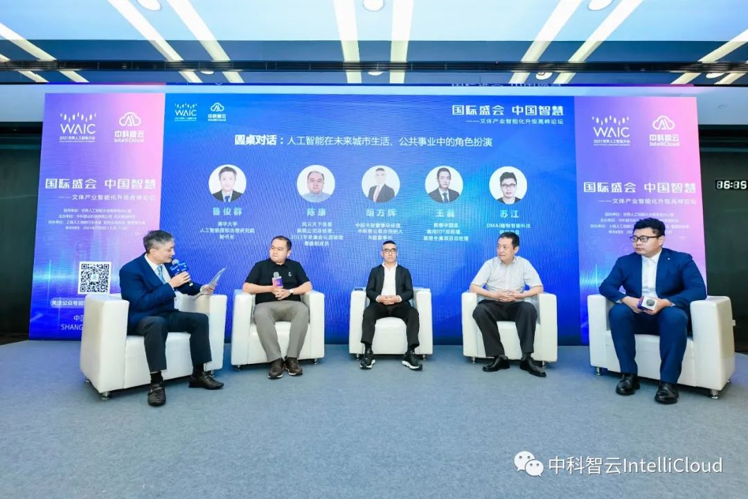 論壇最後由清華大學人工智能國際治理研究院秘書長 魯俊羣、風雲天下信息系統公司總經理 陳康、中投中財董事總經理、中科智雲聯合創始人&副董事長 胡方輝、聯想中國區商用IOT總經理、聯想冬奧項目總經理 王磊、DMAI暗物智能科技研究總監 蘇江就人工智能在未來城市生活、公共事業中的角色扮演的議題進行了熱烈的討論。