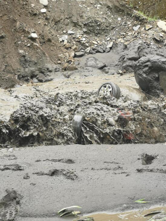 被山洪泥石流砸扁的汽車 受訪者供圖