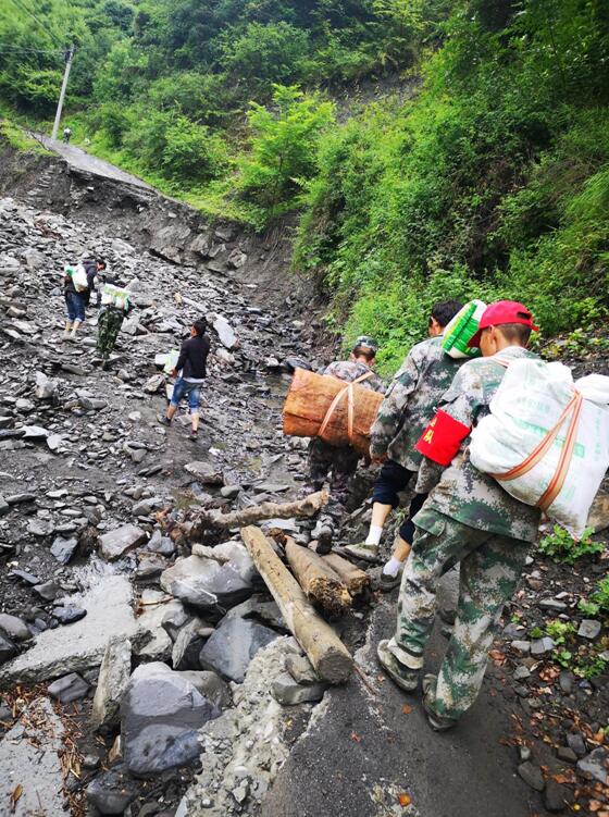 災後第三天,老年人們都集中在村活動中心等待救援。它距離山洪下游有十公里,搶修組再怎麼加緊搶通道路,要到達他們那兒還是需要時間。我們就組了個先鋒隊,每人帶幾十斤的物資先給他們送進去,讓他們堅持到道路搶通。”