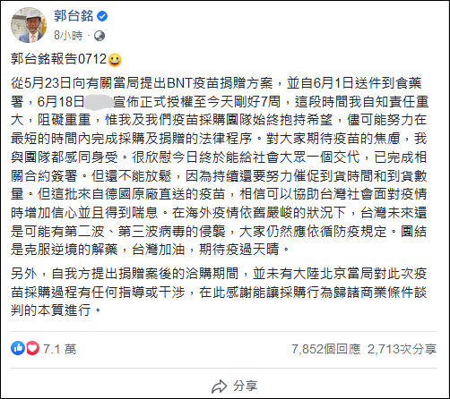 郭台銘説,從5月23日向民進黨當局提出BNT疫苗捐贈方案,並自6月1日送件到“食藥署”,6月18日“行政院”宣佈正式授權至今天剛好7周。這段時間他自知責任重大,阻礙重重,“惟我及我們疫苗採購團隊始終抱持希望,儘可能努力在最短的時間內完成採購及捐贈的法律程序”。