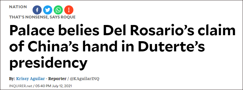 據菲律賓《每日問詢報》報道,菲總統府發言人哈里·洛克(Harry Roque)在12日例行記者會上駁斥了德爾羅薩里奧有關“中國干涉菲大選”的説法,並將其稱為“菲律賓的叛徒”。