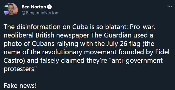 7月12日,《衞報》在報道古巴遊行示威時,不僅將人數誇大到數千人之多,還在一張照片上“指鹿為馬”,將“政府支持者”説成“反政府支持者”,最後《衞報》承認錯誤,並修改圖説。有人在社交媒體上“吐槽”説:“假新聞(fake news)!”