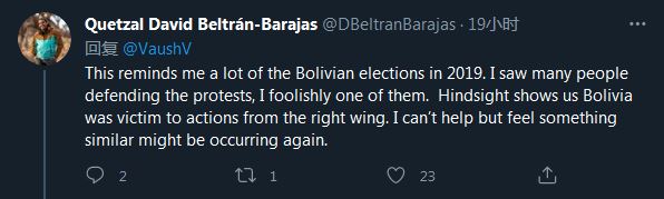 “這讓我想起了2019年玻利維亞大選的很多事情。我看到很多人為抗議活動辯護,當時我也愚蠢地是其中之一。事後看來,玻利維亞是右翼行動的受害者。我覺得類似的事情可能又要發生了。”