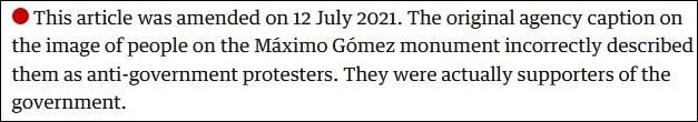《衞報》最終還是修改了圖説。“本篇文章於2021年7月12日修訂。馬克西莫·戈麥斯紀念雕像的人物圖片上,最初的圖説錯誤地將他們描述為反政府抗議者。他們實際上是政府的支持者。”