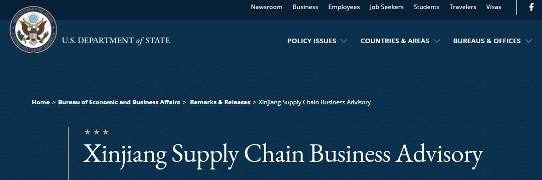 這份商業警示是由美國務院、財政部、商務部、國土安全部、貿易代表署(USTR)、勞工部聯合發佈的,是對去年7月首次發佈的商務警告作出的更新。