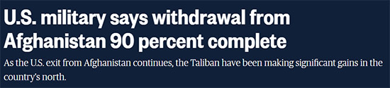根據美國中央司令部的説法,截至7月初,駐阿富汗美軍的撤軍工作已經完成約90%,美軍已正式向阿富汗政府移交7處軍事設施。作為撤離行動的一部分,美軍使用運輸機撤走了約1000批軍事物資,超過1.7萬件裝備已經銷燬。