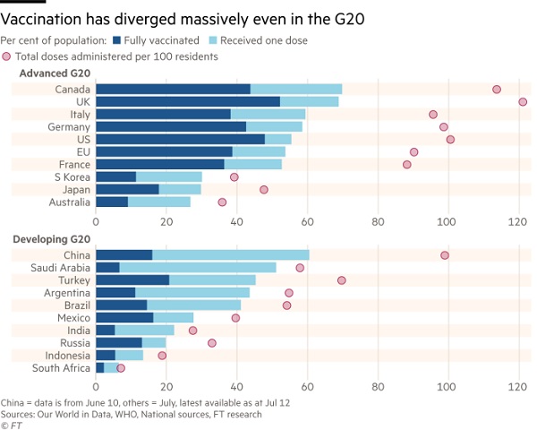 事實確實如此。然而,到目前為止,相形見絀的卻是抗疫行動。截至2021年6月底,“治療新冠病毒加速計劃”(一項全球合作分發治療方案和疫苗的計劃)所需資金缺口高達168億美元。這隻相當於全球抗疫所用資金的0.1%。可恥的是,20國集團並未能解決這一問題。現在看來,高收入國家的兒童似乎會比世界上大多數國家的兒童更先接種疫苗。這是一種犯罪和一大失誤。