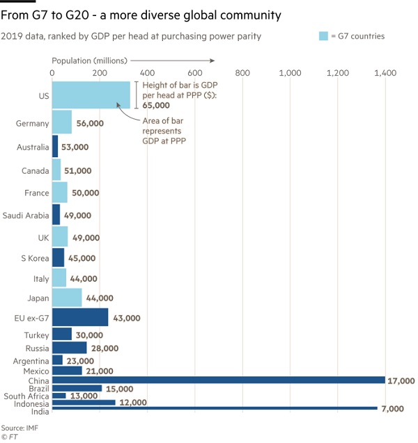 上週末,20國集團(G20)財長和央行行長會議在威尼斯召開,那是一座因海平面上升而沉沒的美麗城市。20國集團擁有全世界63%的人口和87%的經濟產出(按市場價格計算)。它還囊括了全世界最強大的國家並在每個大洲都有成員國。20國集團是我們進行全球經濟治理的最佳機制。
