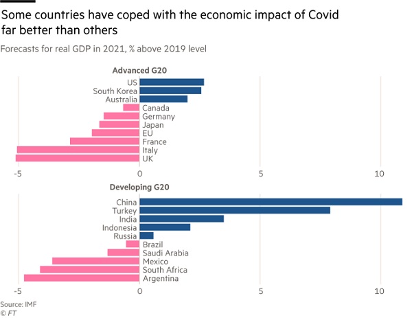 2021年各國預計實際GDP增長率 圖片來源:《金融時報》