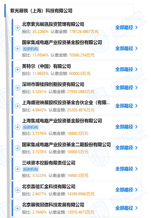 啓信寶信息顯示,紫光展鋭的法定代表人是紫光集團董事長趙偉國。股權結構顯示,紫光展鋭第一大股東為北京紫光展訊投資管理有限公司,持股比例為35.2%,後者由紫光集團間接控股。