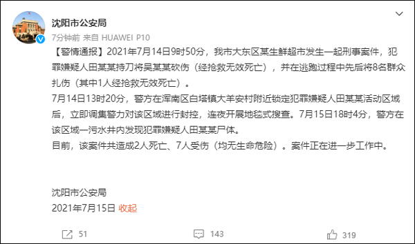 2021年7月14日9時50分,瀋陽市大東區某生鮮超市發生一起刑事案件,犯罪嫌疑人田某某持刀將吳某某砍傷(經搶救無效死亡),並在逃跑過程中先後將8名羣眾扎傷(其中1人經搶救無效死亡)。