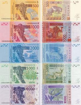 西非法郎最新的五款紙幣,2003年發行。(資料圖)