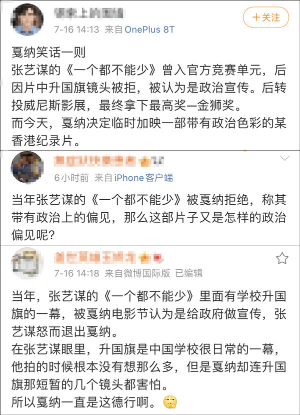 戛納此舉還讓網友們想起了,1999年中國導演張藝謀作品《一個不能少》被時任戛納電影節的主席視為是“替政府做宣傳”,要求張藝謀換片參展,張藝謀怒而撤片退展的事。