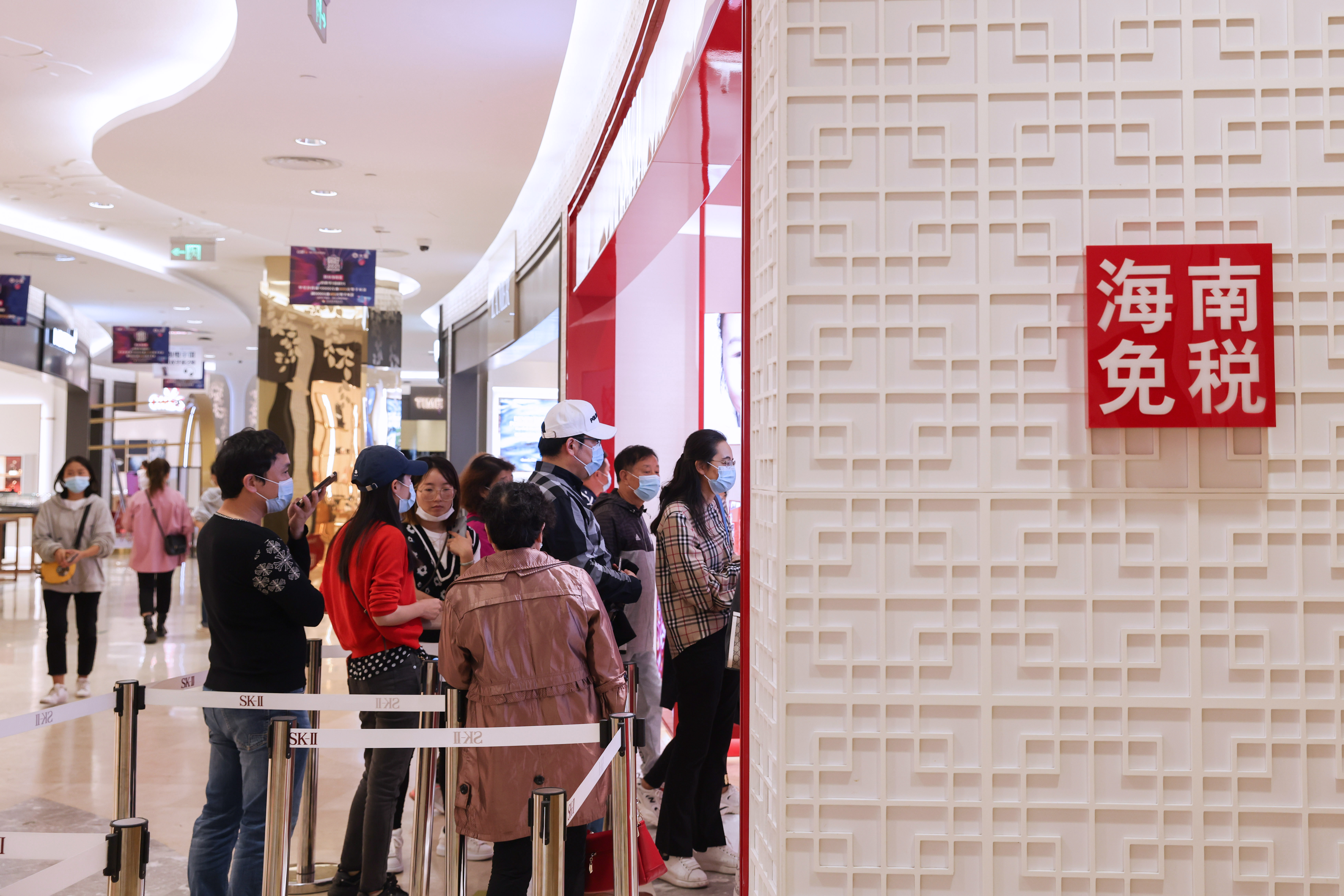 2020年,我國國內生產總值(GDP)首次突破100萬億元大關。圖為消費者在海口日月廣場免税店購物。(新華社)